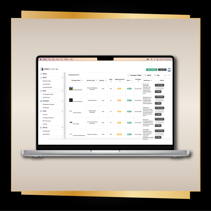 This add-on includes one month of CPGBuyerAI subscription. During this one-month program, you will receive 50 matched buyer leads—including importers, distributors, on-trade, and off-trade buyers—tailored to your product profile. You can select your target region globally and will receive verified buyer contact details along with outreach intel for each account. You will also be able to download your buyer data.